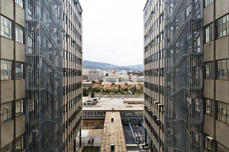 Las plantas del edificio alto son casi diáfanas, ya que las dos torres que lo forman se sustentan sobre pilares situados en la fachada. El travesaño que une las dos torres está sujetado a él y, por tanto, no tiene pilares. Este edificio va formalmente de la planta 2 a la 11. Debajo, de encuentran otras construcciones que, en cuanto a su uso, se considera que forman parte de él; pero, de hecho, poseen estructuras independientes.