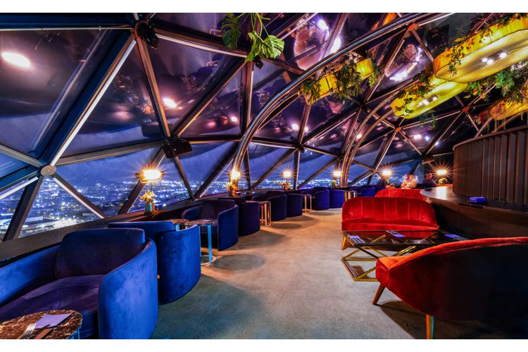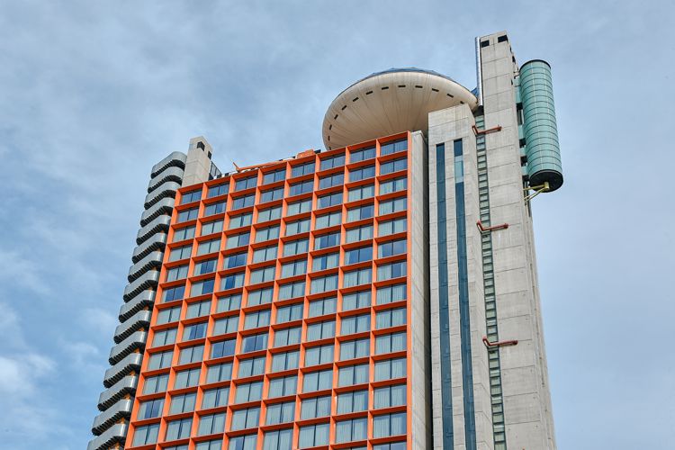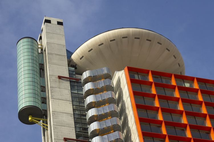 Edificio en forma de L distribuido en una torre de 110 metros de altura que contiene el hotel y en un zócalo de cristal de 30 metros de altura, con el auditorio y un centro deportivo. Ambos elementos quedan conectados por una plaza pública, que se extiende por debajo de la torre y la vincula con los edificios adyacentes. La parte superior de la torre aloja un restaurante cubierto por una cúpula de acero y cristal que fue construida en el suelo para luego elevarla, una vez hecha, hasta la cubierta del edificio.