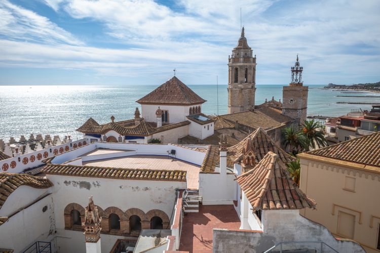 Ubicada en una colina dominando la fachada marítima de Sitges, la iglesia de San Bartolomé y Santa Tecla es uno de los símbolos más reconocibles de la localidad. De estilo barroco y construida entre 1665 y 1672, presenta una composición monumental con tres naves y dos torres. La torre de la izquierda es el conjuratorio, con el reloj municipal, y la de la derecha, finalizada en 1863, es el campanario neoclásico, con cúpula, pináculos y una imagen de la Purísima coronando sus más de 40 metros de altura.