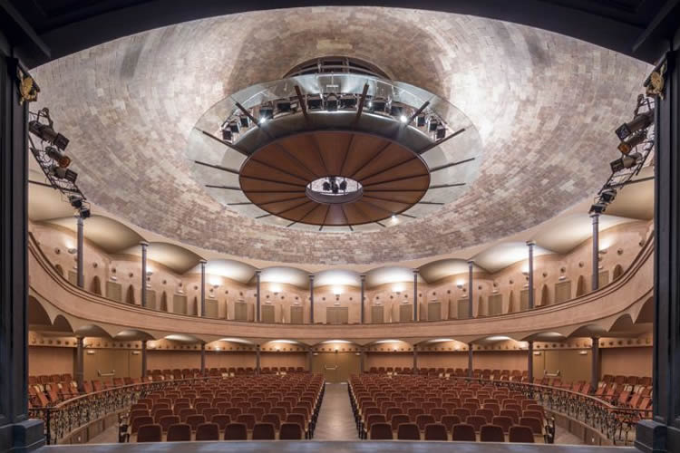 La sala está formada por dos partes: en el centro y bajo la cúpula se encuentra la platea, mientras que la cúpula descansa sobre una zona perimetral de bóvedas de cañón que enmarcan los palcos con columnas. Las dieciocho partes que dibujan los meridianos de la cúpula se proyectan sobre la zona perimetral: tres corresponden al escenario, una parte a cada lado del escenario correspondía al acceso a los palcos, y las trece restantes cubren simétricamente los palcos del primer piso, que correspondían a los doce socios fundadores y a la junta de la entidad.